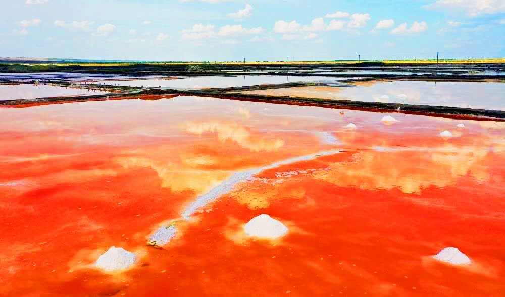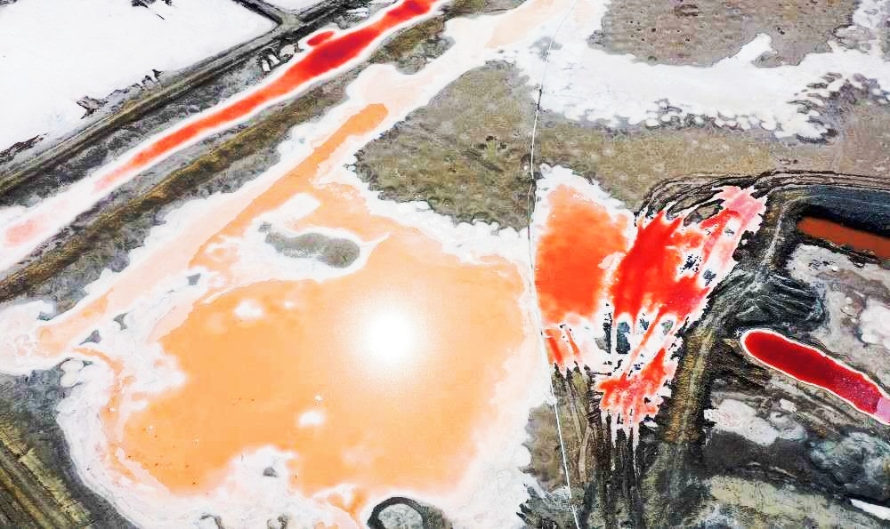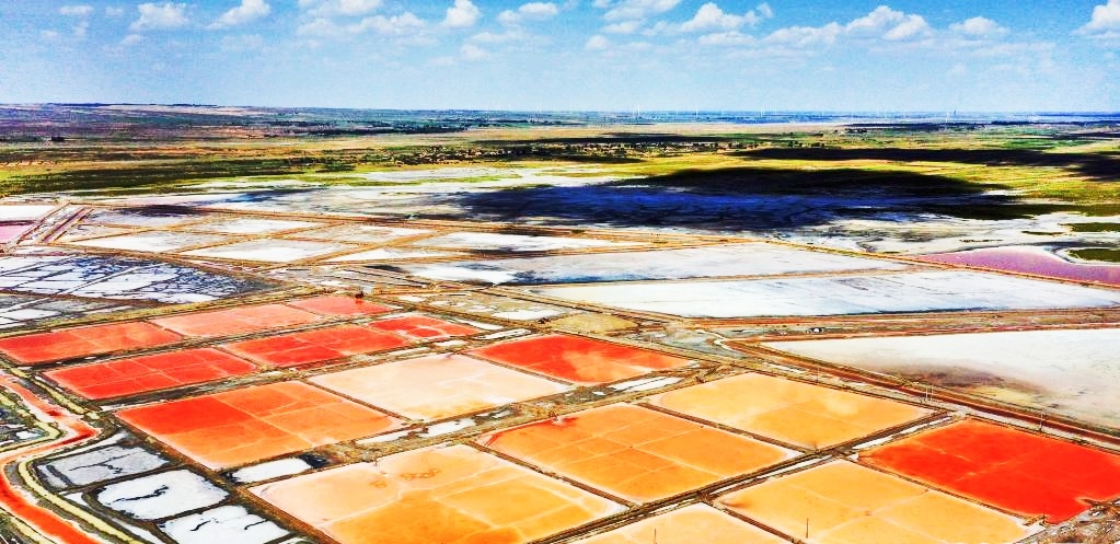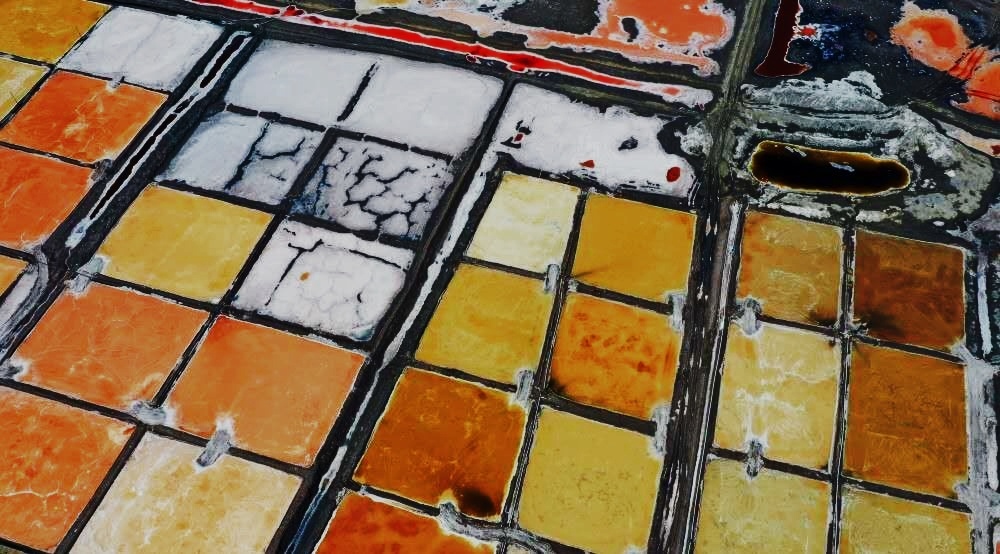陕西省榆林市定边县是陕西省的湖盐产区,盐湖群主要分布在一条西南至东北走向的弧线低洼地带。每年的夏秋时节,湖中不同的矿物成分和藻类,让盐田在高温和光线的共同作用下呈现出五彩斑斓的颜色,仿佛铺陈在大地上的调色板。