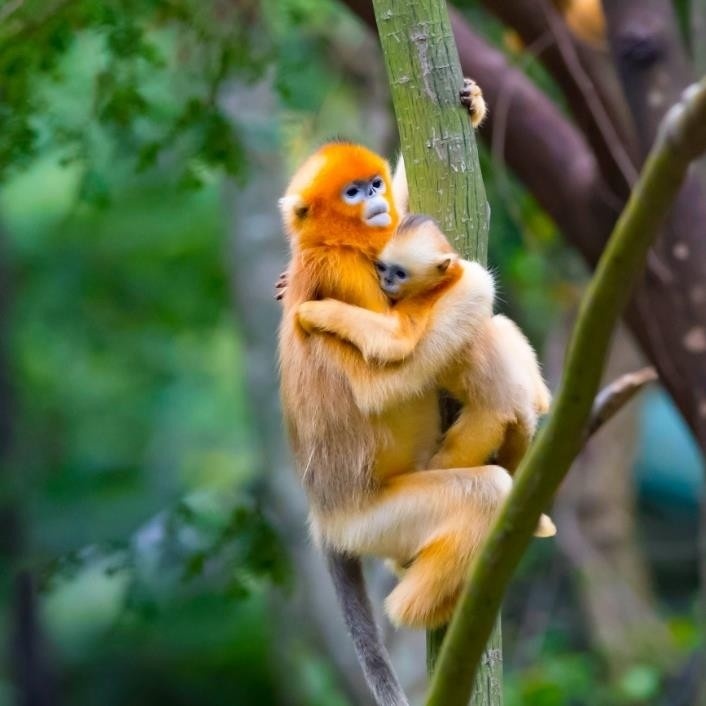 秦岭金丝猴生活在高山密林之中,聪明机警、行踪难觅。其毛色金黄,是名副其实的“金丝”猴。 金丝猴属于树栖动物,主要以常绿阔叶植物的叶、茎为主,移动时利用树枝来回晃动的弹力在树冠之间飞来飞去,煞是潇洒飘逸,被称为“林中精灵”。