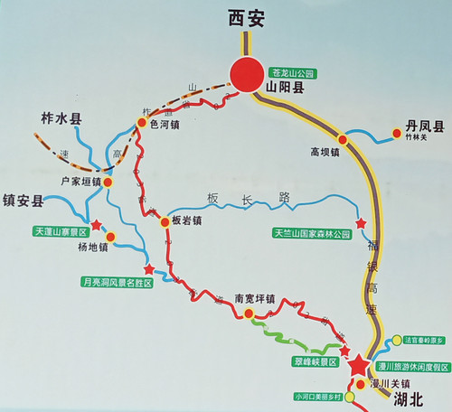 天蓬山寨景区位于陕西省商洛市山阳县户家垣镇韦家垭村向南2公里的银台山梁上,约20公里长的峡谷有72个岩洞。主要有清凉寨、天坑梁、后荫寨、店垭子等,可以看到寨墙、屯兵建寨遗迹、红色遗址等。山顶设有瞭望哨,并有青黑红白四面大旗。 整个山寨呈现天然、古朴、幽静、美丽的自然环境,登上银台山顶,可望两省四县九十六处洞寨,一幅极美的水粉画,不动声色里描绘着美丽、温柔、迷人。 景区以游览峡谷山水风光和体验山寨文化为核心,是集观光,探险,运动,休闲,度假于一体的国家4A级旅游景区。这里一年四季春有百花秋有月,夏有凉风冬有雪。四季景色各有不同,春,山青峰翠,流光溢彩,花团锦簇,春意盎然;夏,凉风送爽,更有无数彩蝶飞舞于长峡之间,构成了五彩斑斓的世界;秋,千山红遍,层林尽染,野果飘香;冬,大雪飘飞,雪压枝头,漫山遍野白茫茫一片,风光无限,令人神往。 景区名称: 天蓬山寨景区 地址: 陕西省商洛市山阳县户家垣镇韦家垭村向南2公里 自驾路线 1.西安至山阳,走福银高速在山阳出口下,走203省道,过色河铺镇—板岩镇—杨地镇(途经月亮洞)。 2.西安至山阳,走福银高速在山阳出口下,走203省道,经过色河铺镇—户塬镇方向—黄龙—韦家垭。 3.西安至柞水,走西康高速在柞水出口下,走凤凰古镇方向—户家塬镇—黄龙—韦家垭。 【周边景点】月亮洞、天竺山、漫川古镇、翠峰峡。