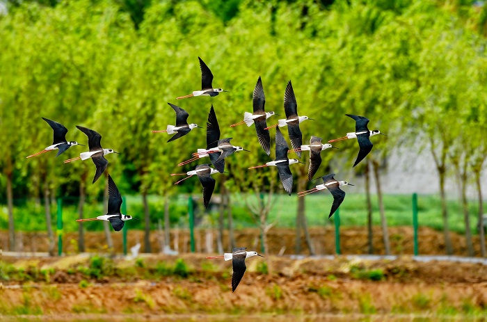 陕西城固县龙头镇六一村水稻种植历史悠久,近年来该镇因地制宜发展壮大稻渔综合种养业,精心打造千亩稻渔共生示范田、千亩荷塘,六一村的生态环境越来越好,吸引了大批黑翅长腿鹬在这里栖息觅食。 黑翅长腿鹬形体优美,体长约35公分至45公分,其腹部呈白色,翅膀黑色,背部羽毛黑褐色,腿部、眼部呈红色,黑翅长腿鹬的腿部细长,因此被誉为“长腿美娘子”。它们喜欢生活在温暖地区的池塘周围,在泥滩和芦苇丛生的浅水中觅食甲壳动物和其他小型水生动物。