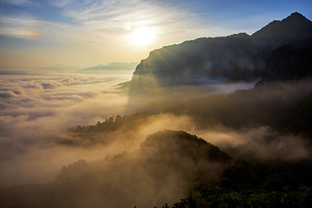汉中市宁强县地处秦岭和大巴山的交汇处,这里是汉江的发源地,有青木川古镇的传奇故事、有汉江源头潺潺的流水、有濒临绝迹的宁强矮马,还有数以万亩计的生态茶园……但这里更有一道纯净的风景,那就是山间涌动的袅袅岚烟。 雨后清晨从睡梦中醒来,山村万籁俱寂,依然还沉睡在梦乡。惦念着山乡那缥缈的袅袅岚烟,于是五点多,便悄悄出发驱车前往山顶,沿途打开车窗,一路凉风夹着雾气扑面而来,带着泥土的香味,温润而清新,沁人心脾。 站在高高的山顶,放眼望去,在熹微的晨光中,山间飘动着白白的雾岚,似云非云、似纱非纱,沿着山体缓缓地飘浮弥漫,像刚刚睡醒的美人,缓缓舒展着腰肢,朦朦胧胧,如梦似幻。 东方渐渐露白,空气中依然充满寒意,雾岚时静时动,偶尔一缕岚烟飘起,瞬间扩散开来,白白的雾绕着山间依然睡意绵绵。 一群早起的鸟从林边飞起,淹没在雾中。淡蓝的天空布满了朵朵白云,好像是从梦中刚刚惊醒,一动也懒得动。 天边慢慢泛起红晕,天空也在变亮,山底绵绵不绝的雾岚氤氲升腾。天空的云朵渐渐变红、变亮。雾慢慢醒来,不断在涌动,在变化。霞光透过山脊洒向山间,云蒸霞蔚,雾气如抽丝般蒸腾,在茫茫的雾海上一缕缕飘起,在山间沸腾,山峰若隐若现。 远处的山岗若隐若现,也有乐山好雾之人,时不时发出赞叹,他们用相机记录这迷人的美景。 袅袅岚烟的景观,只有在山野较为狭长的山谷里才最为壮观,因为山谷的下端有风和气流的涌动,起到助推作用;上口有山垭风口的流动,犹如烟囱效应,形成一个流动的气场,加之太阳的光热作用,就会显得更加具有魅力。 有时会有空气回流现象,在山垭口就会形成雾岚倒流,成为美丽的白雾瀑布,也是难得一见的奇观。