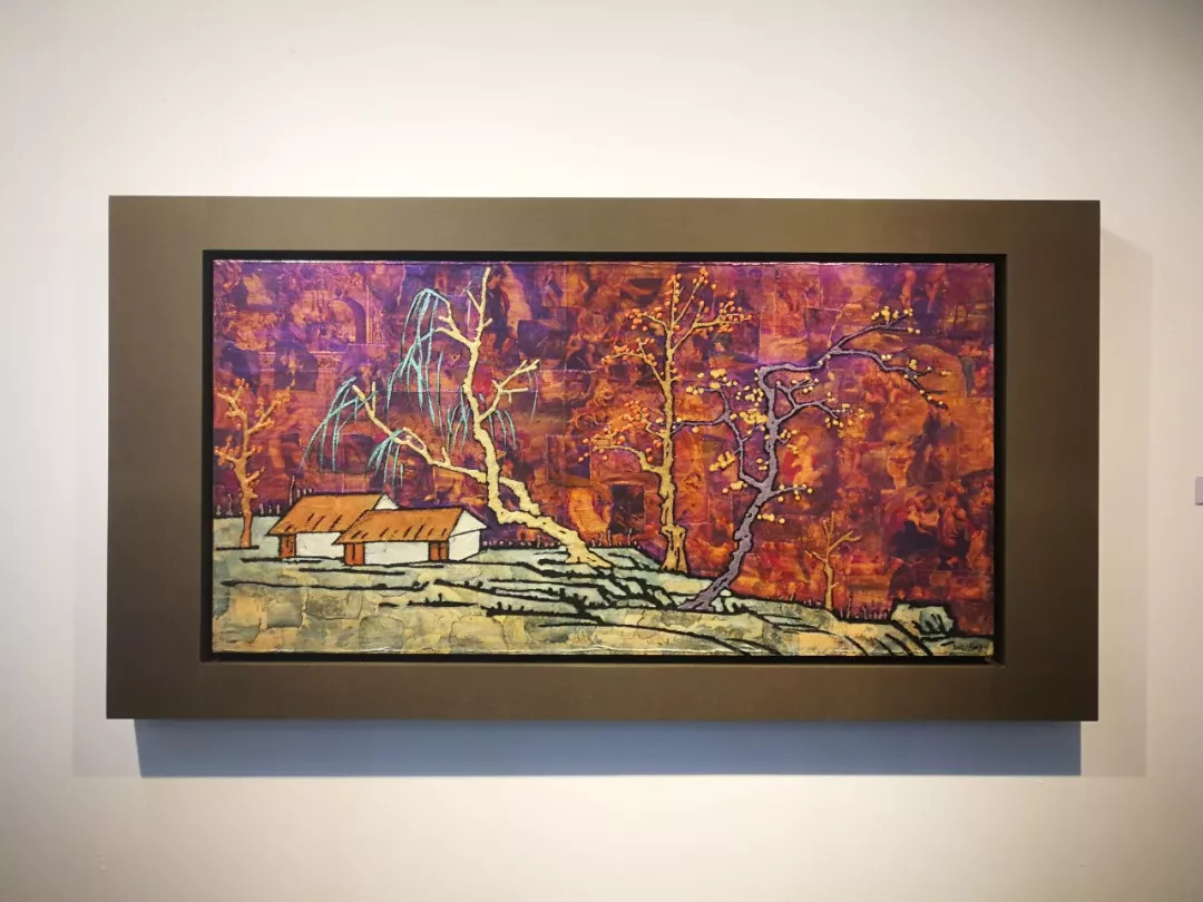 《与蒙德里安对话之四》 薛松 140×160cm 布面综合材料 2012 艺术家本人说:火把身边的书本、画册、杂志、报刊及其他印刷品从有形中解体,这些材料了神形走出了框框,隐含了大量原先不见的信息。创作便从可见到不可见的信息中拾遗自己的语言,以综合材料为媒介,重建一个领悟的艺术境界。这里隐藏了一个文学观念的秘密:隐喻的作用。焚烧带有仪式感,例如祭奠、拜祖、告别等社会习俗,甚至还会联想宗教。古老的人类篝火欢庆、商议大事,火作为甲骨文象形字,昭示生命之光。燃烧的过程中,灰烬作为结局呈现出的物性,就有了无尽的所指。但它的本身就只有一个概念:燃烧剩余物。出于哲学和诗的传统功用,在它身上就发挥了无尽的阐释,灰烬是一,也是一万。由此,物之先是大量的、有形的、可见的信息,经过艺术家的主观焚烧,变成了另外的物性,不可逆转的、彻底变性的物态。再由这个可见的东西,隐喻的力量赋予它承载一切的信息,包括焚烧之前的信息,这个转化的过程达到了真正的,中国道家学说中的“生万物”。也通过这个方式和桥梁,艺术家传达当代社会中的城市秘密,他本人说的:上海的秘密在于它没有历史。创作从无端开始,以自己的语言无限复制一种单一的话语,又走向无限的阐释。 四、绘画的传统性 作品中的传统书画形态是整体风格的重要方向,艺术家本身曾习过水墨山水。可以说中国传统文化的传承记忆由来已久,它存在创作中的一切行为中。包含了秘密的发现。以“与罗斯科对话”系列为参照(2012年)。作品上的山水形象并不复杂,多是一个枝头、一处人家、一朵祥云,继承了中国绘画的精神:得意忘象。罗斯科的抽象绘画,单纯的色彩散发威严、仪式、纪念碑性的感受,与中国禅意的思想有异曲同工之处。薛松稍微改变了一下形式,将色域变成了拼贴的具体形象,但远观的整体感受力还是不变的。当代艺术理解观念出发,到达另一个观念的发现,解决了绘画本质的命题:绘画过去是什么,现在是什么;绘画这个地域的思想,绘画那个地域的思想;从历史而言,艺术如何建一个桥梁让观众便于理解经典的魅力。同时在局部的细处,大量的碎片又承载了社会的数字化、信息化、复制性特征,以反讽的方法,批判性地描绘了城市的现状。2013年的“对话蒙德里安”系列也传达了视觉由简约到密集的矛盾,打通了中西思想的共通性。一生二,二生三,三生万物。不仅如此,画面甚至只采用了教学材料中的《芥子园》图像,采用人们耳熟能详的范式,来传达观念的所思所想。