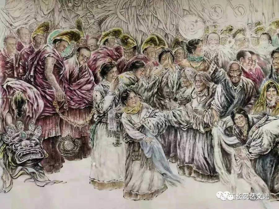 午后饮茶,突听手机的连串提示音,匆匆打开阅读,是马师从银川发来的几张图片信息,是他赤膊挥汗续作已多年未完成的巨作《亮佛节》。 突然想起与马师十年前甘南采风之旅,那一幕幕画面在我的面前串接起来:聚焦在藏区的黄河源头,在冬日雪山下的黄河岸边,马师拿着照相机步履蹒跚的追拍着背水的藏族姑娘,艰难地走进冻结的泥泽里,观察着骑牦牛的少年。 亮佛节的大会上人挤如蚁,为拍到全景资料同时为尊重民族信仰,他跪在寒风里的越野车顶忘我地去搜索。 一个出生在古城墙下,沉香亭边的长安文人,今天在中国画这个学科里被人广泛认可,这条路的确是艰辛的。 有人说年纪大了有一种儿童心态,其实是自然生成的烂漫气息,看见马师作品的人都会觉得他画心洒脱、写实画语流畅,构成点化,随意留拙,率然而成,看着舒服,有亲切感。
