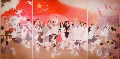 放飞梦想(中国画)张琳 高亢嘹亮的国歌响起,鲜艳的五星红旗迎风飘扬。无论是在奥运健儿夺冠的颁奖典礼上,还是在青春飞扬的校园升旗仪式上,我们常常能看到这样激动人心的一幕。国旗,是国家的象征,是民族精神的图腾,她飘扬在新中国成立以来许许多多重要的瞬间,飘扬在每个中华儿女的心头。在描绘新中国发展新貌、人民生活图景的丹青佳作中,也经常能看到那方红艳艳的国旗,她点亮了画面,也引燃人们充盈于心的激情。 五星红旗迎风飘扬,胜利歌声多么响亮 1949年9月27日,中国人民政治协商会议第一届全体会议通过《关于中华人民共和国国都、纪年、国歌、国旗的决议》,宣布中华人民共和国的国旗为红地五星旗,象征中国革命人民大团结。 10月1日,开国大典上,毛泽东主席按动电钮,瞬间,新中国第一面巨幅国旗如一轮红日般冉冉升起。 在董希文所绘的油画《开国大典》上,天安门广场上空一面五星红旗高高飘扬,下方的人群汇成了欢乐的海洋。一面红旗,升起了中国人民当家作主的骄傲,映照着新中国无限美好的未来。 蒋兆和创作的《中国人民从此站起来了》,画作题款显示创作于“中华人民共和国诞生之日,一九四九年十月一日”。画面是两位劳动人民的形象,女性手持镰刀,男性双手紧握旗杆,画面上方近1/2的空间,是一面迎风猎猎招展的五星红旗,纪念碑式的整体构图,令人感受到新中国成立之际人民心中的舒展、愉悦、自豪之情。 “线儿长针儿密,含着热泪绣红旗绣呀绣红旗。”五星红旗是中华人民共和国的象征,无数革命先烈为了人民的解放抛头颅、洒热血,用鲜血染红了旗帜,换来新中国的诞生。以《红岩》中江姐及难友们解放前夕在牢狱中绣制五星红旗为主题的绘画作品,如李汇泉的《绣红旗》、李跃进的《解放前夜·绣红旗》、卢志强《绣红旗》等画作,都表现了革命先辈憧憬美好新中国、矢志不渝的坚贞情操。 你的名字比我生命更重要 “国旗国旗真美丽,金星金星照大地,我愿变朵小红云,飞上蓝天亲亲您。”一首童真的歌谣,唱出朴素真诚的情感。了解国旗、尊敬国旗、热爱国旗,是每个小学生的入学课,国旗教育也是每个公民的必修课。 在新中国成立初期一直到二十世纪七八十年代发行的新年画和宣传画中,有许多礼赞国旗的作品,如上海教育出版社发行的《尊敬国旗》、人民美术出版社发行的《热爱祖国》、少年儿童出版社发行的《国旗,像太阳一样红》、上海人民美术出版社发行的《尊敬国旗 热爱祖国》等。这些作品用简洁鲜明的形象,在一点一滴的潜移默化中,让国旗的情感符号烙印在每个人心中。 国旗是国家主权的象征。陆地边关,海上边防线,祖国领空……国旗高扬,便宣示着中华人民共和国主权的确立和不容侵犯。在柯如山的油画《雪域巡疆图》中,战士们顶风冒雪跋涉在空气稀薄的青藏雪原,一面鲜艳的五星红旗在茫茫雪山间格外醒目,这一抹鲜红,是整个画面的“画眼”,使得画面色彩对比强烈,把高原战士们不畏艰险守卫祖国边疆的精神无声地传达出来。牟达器、付巍巍、张贯一创作的油画《边境线上活界碑——魏德友》,表现了新疆生产建设兵团退休职工魏德友五十多年如一日扎根艰苦偏远地区巡边护边的感人形象,迎风招展的五星红旗如天边的红霞,照亮了祖国的边疆。在米巧铭根据王继才和王仕花夫妇坚守开山岛、守卫祖国海防线的感人事迹而创作的油画作品《孤岛卫士》中,王仕花手握旗杆,王继才正在向国旗敬礼,海天寂静,五星红旗映照着主人公伟大的心灵,灼灼闪耀。 国旗是中华儿女心灵的纽带。在表现和平解放西藏主题的作品,如韩书力的《高原祥云·和平解放西藏》、赵友萍的《百万农奴站起来》中,在描绘香港、澳门回归祖国,如廖宗怡、张树军的《1997·香港防务交接》,罗田喜的《使命—欢送驻港部队》,徐里、谭乃麟的《不忘初心,坚持“一国两制”,香港的未来一定更美好》,邢俊勤等的《澳门回归》中,在表现中华儿女一家亲,如李绍忠的《两岸同胞兄弟情》、王其钧的《身远心近》等画作中,五星红旗或在旗杆上高高飘扬,或在人们手中轻轻挥舞。一面国旗,牵动着炎黄子孙对祖国的爱与深情,当“我和我的祖国”歌声响起,当国旗在蓝天白云下舞动,祖国就在身边,那样生动,那样亲切。 五星红旗你是我的骄傲 有一种感动叫中国红,有一种骄傲叫五星红旗。 为国争光,挥洒汗水,让国旗在赛场上高高升起,是体育健儿的最高梦想。在表现奥运健儿夺冠场景的作品中,经常出现国旗画面。如李爱国的中国画《辉煌·奥运之星杨霞》,作者选用奥运金牌获得者杨霞擎举夺冠的瞬间作为画面主体,运动员身上的一面国旗在胸膛上闪亮,她在有力地宣告:“我是中国人,中国队赢了!” 驰骋江河,翱翔云天,让国旗伴随大国重器彰显国之荣光,是中国人的科技梦、强国梦。刘伟佳的《穿越江河湖海·中国奇迹工程南水北调》、黄坚的《中国梦·探月》、孙远志的《嫦娥三号》、毛珠明的《中国梦·嫦娥奔月》、庹光焰的《星月征途》、桑建国的《中国未来航母畅想》、时卫平的《极地科考·雪龙号驶进北冰洋》、范春晓的《中国制造走向世界——C919大飞机》等描绘我国重大发展成就的画作中,都有一个不可或缺的元素——五星红旗,她向世界传达着明朗的中国红、自信的中国红,这蓬勃的红色里,是