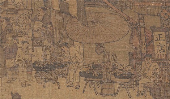 宋 张择端 清明上河图(局部) 虹桥上的卖稠饧摊 绢本设色 北京故宫博物院藏 孙羊店前第二处摊贩,是担式摊。他的桌子要比邻摊小得多,桌上只有一个大的黑圆板,圆板上放的物品则和邻摊一样,散放着小碎块,堆放着较大的扇形体与较大的碎块。这个小贩正在做生意,身体半俯,目光专注,右手持一小棍似的物件,左手指一小块,顾客是一年轻的爸爸,也正右手指那个小块,左手还牵着一年幼的小儿。 虹桥上的摊位,也是坐地摊。一根长棍支起的四方大棕盖下,小贩坐式与孙羊店门前的坐地小贩一样。一张低矮的桌子上放了两个白圆板,一个偏黑的同样大小的圆盘。两个白圆板上散放着少量的小碎块,黑圆盘上放着几个较大的碎块。圆板圆盘后,堆放着大约3块较大的白色的扇形体与一大块白色的长方体。桌子靠虹桥这一侧,还有一块布搭成布挡,以免桥栏边的行人碰着。
