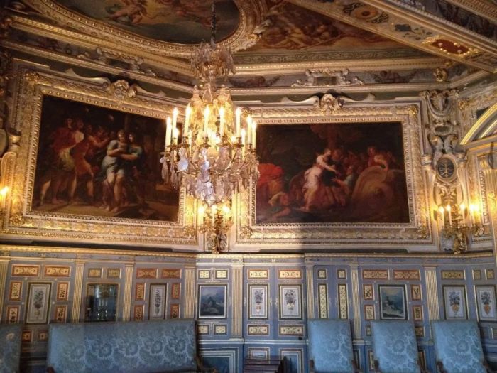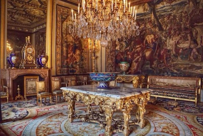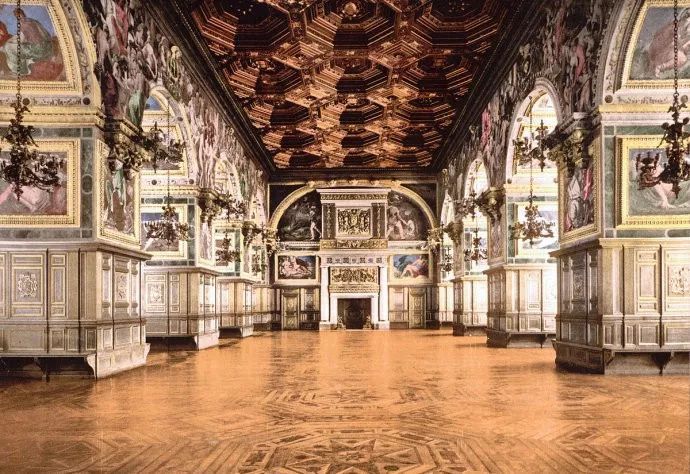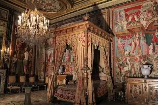 凯瑟琳·德·美第奇 这座宫殿本身就是细木工艺艺术的奇迹:精美的木雕,镶嵌着珐琅和威尼斯镜子的面板嵌在墙壁里。有一个房间被称做“镜阁”,墙壁上镶嵌了100多面玻璃镜;在“珐琅阁”里,镶嵌着74件王公贵族和贵夫人肖像徽章,高度超过1英尺,还有选自古典神话和圣徒传记的寓言画。
