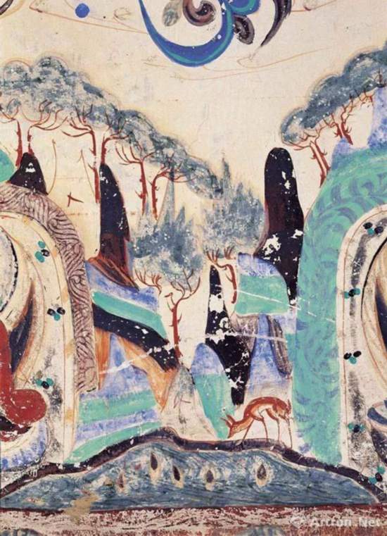 莫高窟第217窟 山峰 盛唐 横看成岭侧成峰,远近高低各不同,大概就是眼前的这幅景象了。 山崖上植物丛生,花朵各有各的颜色。如果梵高、莫奈他们能来这里,说不定笔下会生出什么样的精彩,但一定让人看了就觉得清凉。 消夏方案四:山麓见鹿 树影泛浮