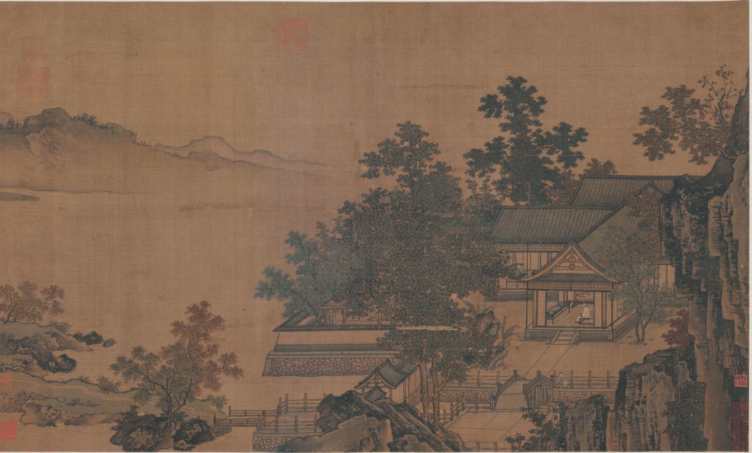 刘松年(南宋)《四景山水图卷》之秋景 最能体现画家刘松年的艺术风格和成就的,当数《四景山水图卷》,其四段分别描绘杭州春、夏、秋、冬四时景象。其中第三幅所绘秋景,老树经霜,朱紫斑斓,庭院环绕以树石围墙,有小桥曲经通幽,与外部湖山景观相隔离,似乎有遮挡秋之意。“天如水色”湖水与天色浑然一体,人在其中居住若如仙境一般,透过树木与山石的空隙,几间屋宇错落有致地分布在画面中,庭中窗明几净,有一高士独坐在屋内,一派闲情逸趣,不减文人半点雅致。桥边栏杆处一孩童似在园中戏水,又或正在给水煮茶吧,画面中有两座小桥分别在园门的内外,两桥结构各不相同,使人在进出园子时有着不同的玩味、不同的感受,可见画家在绘画中又是何等的精细入微,把这些细节都完美的表达在画面中。正是李白诗中“秋色无远近,山门尽寒山”的化人意境。 编辑:张瑞琪 |