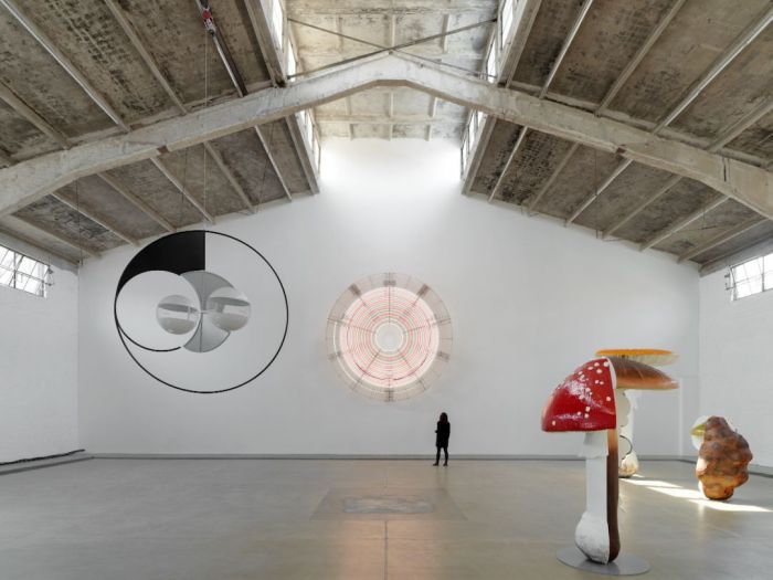 Giant Triple Mushroom 2017 Fly Agaric - Fliegenpilz - Amanita muscaria / Carbolic Champignon -Karbolegerling - Agaricus xanthodermus / Monk’s Head - Mönchskopf -Infundibulicybe geotropa Polyester mushroom replica; polyester paint, synthetic resin, acrylic paint,wire, putty, polyurethane, rigid foam, stainless steel Installation view at Henie Onstad Sanatorium, Henie OnstadKunstsenter, Høvikodden, 2017 © Attilo Maranzano