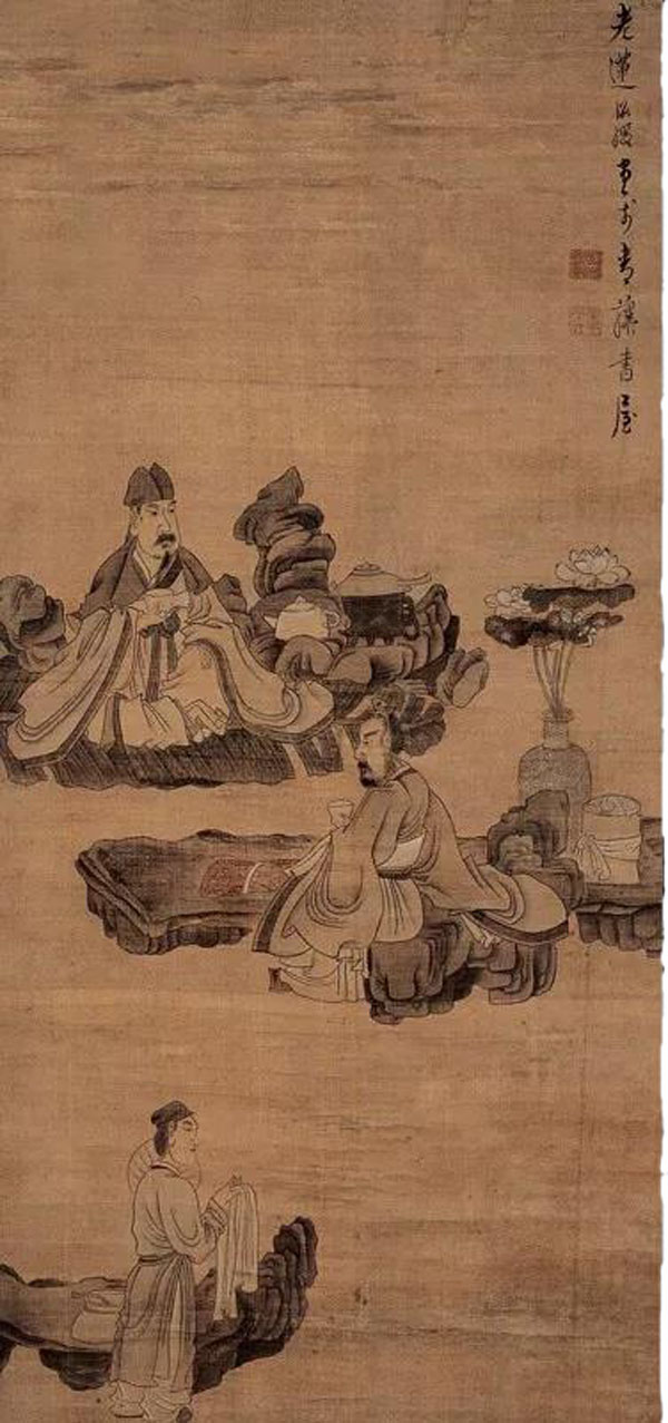 陈洪绶 《停琴品茗图》(明) 图中描绘了两位高人逸士相对而坐,琴弦收罢,茗乳新沏,良朋知己,香茶间进,手捧茶杯,边饮茶边谈古论今。