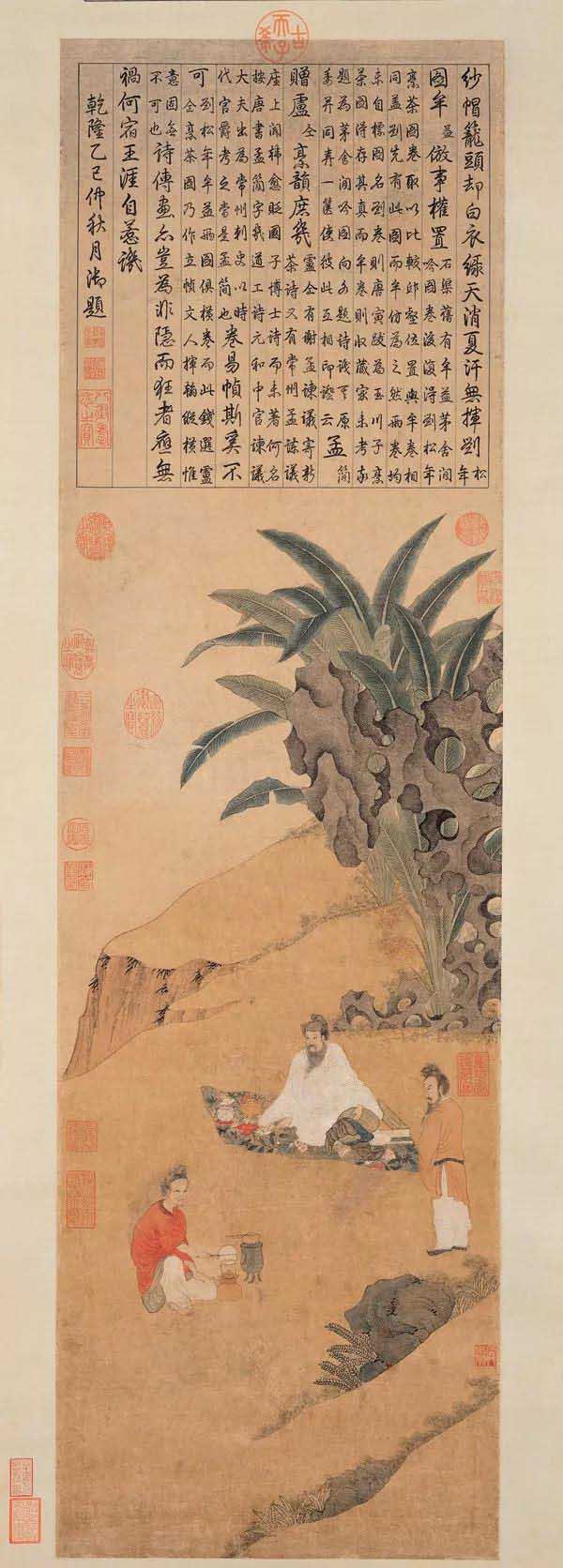 丁云鹏 《煮茶图》(明) 画中卢仝坐蕉林修篁下,手执团扇,目视茶炉,正聚精会神候火煮汤,图下一长须仆捡壶而行,似是汲泉去,左边一赤脚婢,双手捧果盘而来。画面人物神态生动,描绘出了煮泉品茗的真实情景。 【清】