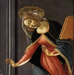 Botticelli /Cestello Annunciation, c.1489 波提切利(Botticelli)的《圣母领报(Cestello Annunciation)》 不同于安杰利科画中,天使站立在门廊内,圣母谦卑地半跪在木凳上,低垂着头。波提切利的天使,几乎是匍匐现身,单膝跪地,眉眼间显出谦卑而温柔的神情,仿佛不是来“告知”圣母受孕,而是来“祈求”圣母生下神的孩子的。