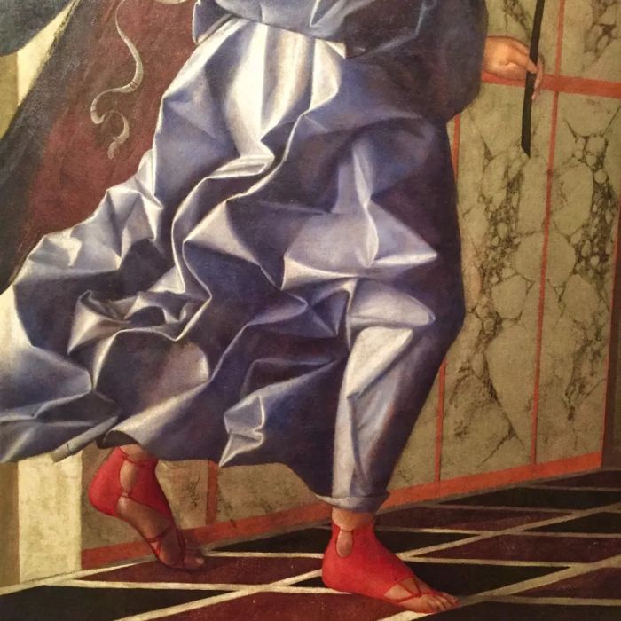 Jacopo da Montagnana / The Archangel Gabriel and the Virgin Annunciate,c.1494 - 1497 局部 credit: 摄于威尼斯美术学院美术馆 再比如乔瓦尼·贝利尼(Giovanni Bellini)的《圣母领报(Angel of the Annunciation and Virgin Annunciate)》,天使一头红发,脚踩 fashion 的红色罗马凉鞋,袍子上的衣褶颇有点超现实主义的影子,完美诠释了威尼斯画派