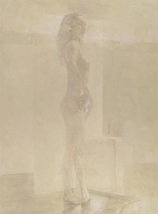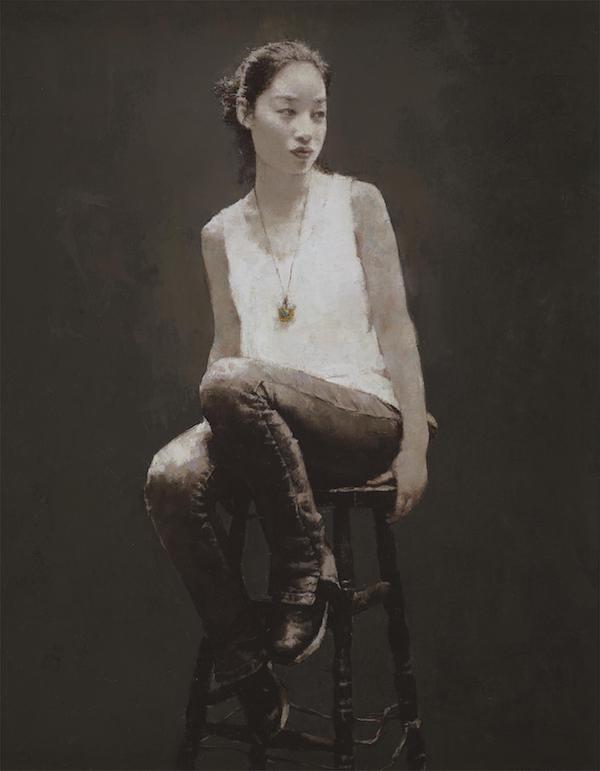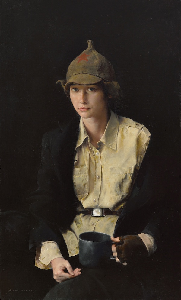 郭润文,《扮成士兵的凯特》,布面油画,100cmx60cm,2014年 中国艺术在20世纪以来,一直以思想主题和社会问题作为自己的价值判断标准,以对主题性阐释的深度和批判性的介入强度为价值评判标准。1989年以来的当代艺术,也是讲用现代艺术的手段和语言表达艺术家对社会变革的敏锐的反应。但是在另一个方面,我们又感觉到当下的艺术界,如果只谈形式和语言,就是一种从古典的写实语言到当代的一种技术性表达的转换。在当代艺术中判断一件作品的价值时,我们经常游离于这两者之间,一个是看作品的社会批判指向,一个是看作品的语言自身的表达水平。当然,一幅好作品,除了语言好,还要有观点,能了解观众,会讲故事,能形成叙事方式(narrative mode)。对画家来说,不仅要有技术能力,还要能关注大问题,有同情心。著名油画家钟涵先生在第四届中国油画展的座谈会上指出,中国油画近十多年来蓬勃发展,取得了不少成绩,但是也内藏着不少问题,最突出的是重数量不重质量。近十年来越来越粗制滥造。他强调要有质量意识,就油画的语言质量与精神质量这两方面来说,某种意义上,精神比语言更重要。我们看一幅画,最容易打动自己的,是绘画的品质,品质与精神有关,说到底,语言之在,在于精神。对于中国画家来说,这就是绘画中的”中国精神”,这种精神不是高蹈虚空,而是包含着中华民族精神、东方文化的精神、画家的人格精神等。