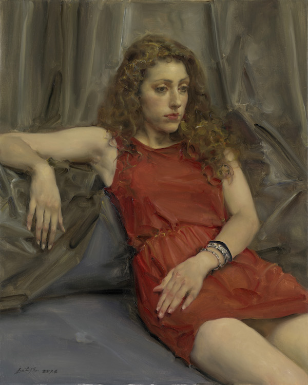庞茂琨,《红衣女孩》,布面油画,100cmx80cm,2017年 附:展览板块 历史风神,文化肖像。人物的塑造最显油画之魂,其写实性语言最集中地凝聚雄心弘毅的艺者情怀。 作者(19人):全山石,靳尚谊,曹新林,张祖英,徐芒耀,郭北平,俞晓夫,张正刚,杨飞云,郭润文,孙景刚,林永康,王羽天,庞茂琨,殷雄,崔小冬,何红舟,马琳,赵培智