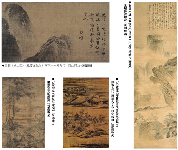 南宋玉涧《庐山图》,冈山县立美术馆藏 然而,从日本冈山县立美术馆给出的展品清单来看,一些重量级的展品所展出时间有所不同,分为前、后两期展出。即(传)董源的《寒林重汀图》、燕文贵的《江山楼观图卷》、佚名《秋江鱼艇图》、张瑞图的《 太白观瀑图》、江上琼山《滝山水图》的展览时间为8月31日至9月17日;传)李成的《乔松平远图》、(传)夏珪《山水图》、石涛《庐山观瀑图》 则为9月17日至9月30日展出。 在展览中,日本冈山县立美术馆以雪舟和浦上玉堂的馆藏为首选,且展示了与冈山县有所渊源之画家的水墨山水画,以及他们所憧憬学习的中国绘画作品。其中,1993年10月入藏的玉涧《庐山图》,可谓馆藏水墨山水画名品的代表,而同为馆藏的雪舟仿玉涧《山水图》(重要文化财产),则是自玉涧习得泼墨技法的作品,足见作品间有深厚的渊源关系。此外,庐山所在的江西省和冈山县于1992年缔结友好合作关系,25年来始终保持着相互交流。