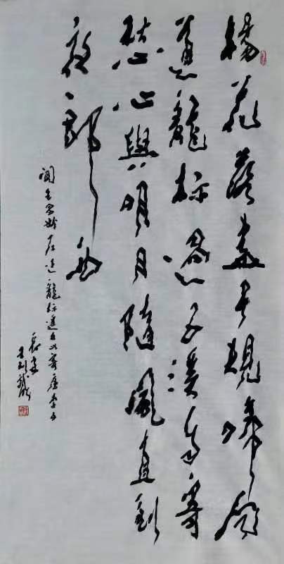 然而,他深知仅有这些还远远不够,要有自己的面貌和个性,这才是他的突破点。他先走过青藤、八大的大写意一路,又走过宋元工笔一路,最后确定了徐悲鸿、王子武的小写意一路。最近,他又在渐变离开这一路而探索大小写意之间、偏向纯文人画的路子。他的书法是他探索新路的最好阐释。起先,他写汉隶,又临魏碑,他爱石鲁的刀削斧劈,又稍嫌其含蓄不足,他又借鉴王子武书法的曲折藤饶,写出含有大篆金石味道的“王式模样”。虽则目前还不能定型及被社会公认,但这种抱道不屈的探索精神是难能可贵的。