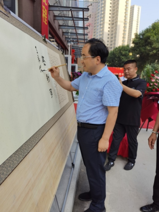 此次书画展经过半年的筹备,共征集书画作品286幅。经筛选,展出100幅精品,这些作品主题突出,立意鲜明,或描绘祖国的大好河山,或回望党的发展历程,或记录人民的幸福美好生活,以生动的笔墨表达建党一百周年的喜悦之情。 开幕式上,举行了“中国书画杂志社书画创作基地”“陕西省青年书法家协会创作基地”“泾阳县书法家协会培训基地”“西咸新区泾河新城教育卫体局社区教学示范点” 的揭牌仪式。 举目崇文古塔,俯瞰泾河东流。