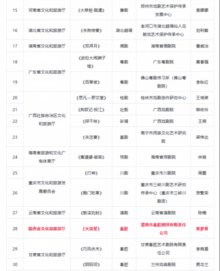 文化艺术网-文化艺术报讯(全媒体记者 高盼成)日前,由文旅部主办的首届全国戏曲新人新作展演作品遴选结果公示,由渭南市秦腔剧团有限责任公司黄梦春主演的秦腔剧目《火流星》入围。