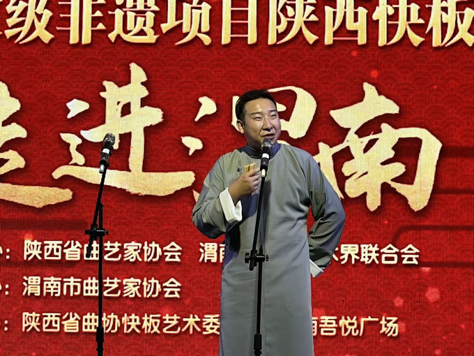 文化艺术网-文化艺术报讯(全媒体记者 高盼成)9月13日晚,由陕西省曲艺家协会、渭南市文学艺术界联合会联合主办的“国家级非遗项目陕西快板走进渭南”活动,在渭南城区吾悦广场精彩上演。陕西快板领域众多精英齐聚一堂,为渭南市观众献上了一场精彩绝伦的曲艺盛宴。 活动由陕西省曲艺家协会副秘书长、西安青曲社总经理师戈主持,中国曲艺最高奖牡丹奖获得者纪亮辰表演的陕西快书《鲁达除霸》首先开场。