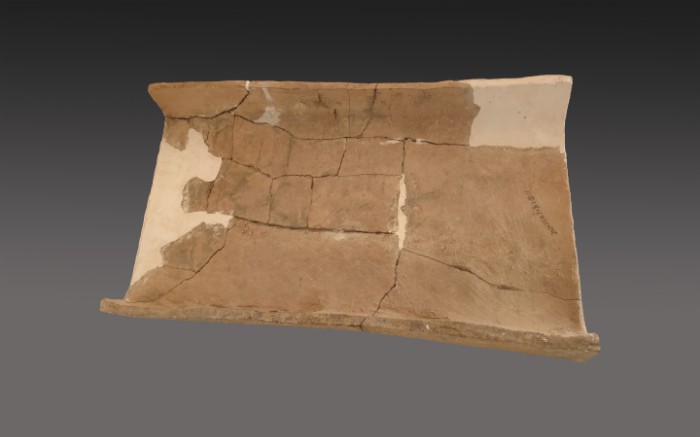 异形板瓦 2018年夏,考古工作者在镐京遗址官庄村南勘探发现了一座西周大型夯土建筑基址,编号镐京14号建筑。这是继20世纪80年代以来,考古工作者在镐京遗址勘探发现11座西周夯土建筑基址之后的又一次重要发现。 据陕西省考古研究院研究员岳连建介绍,该14号建筑基址位于镐京遗址中西部滈河故道南岸的郿坞岭高地,与镐京5号、11号西周建筑基址相距不足百米。2019年春,经国家文物局批准,镐京考古队开始对14号建筑基址进行考古发掘。
