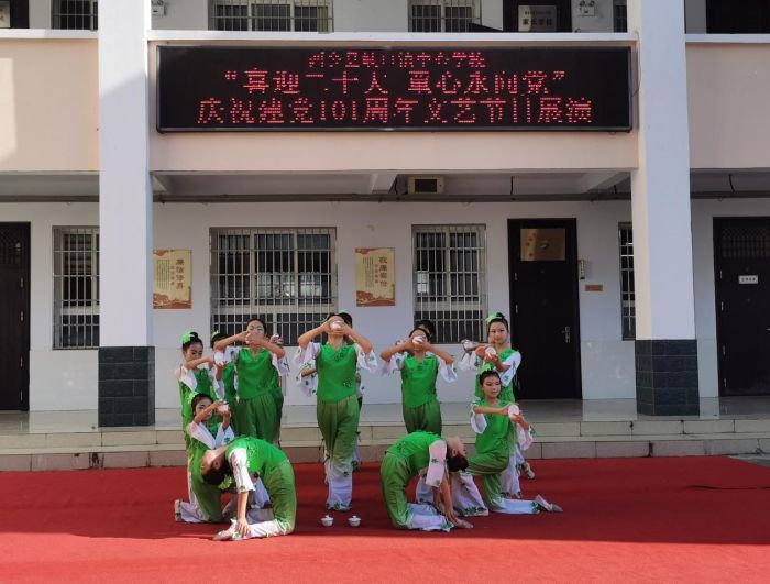 党支部乐思娴老师向全校师生进行了“回顾奋进路 展望新征程”主题演讲,号召全体干部职工珍惜工作岗位,继续保持奋发有为的精神状态,牢记使命职责,坚守共产党人的坚强信念,为振兴乡村提供优质高效满意教学水平。 文艺展演开始,回顾光辉历程,寄语幸福时代。学生通过舞蹈、唱歌等方式,特别是二年级带来的《闪闪红星》和舞蹈社团的《青绿溢香》红色故事,重温中国共产党波澜壮阔的革命史,讴歌中国共产党的丰功伟绩。学校少队部对本学期在少队工作表现突出的中队辅导员及班级进行表彰,号召全体学生时刻牢记肩负的历史重任,奋力谱写属于自己的青春篇章。 校长罗小勇带领全体教师宣誓,并寄语老师们忠诚教育事业,做 “四有好老师”,有理想信念,有道德情操,有扎实学识,有仁爱之心,保持工作激情不减、干事精神不褪,保持锐气、朝气和志气,推动该校教育事业再上新台阶。