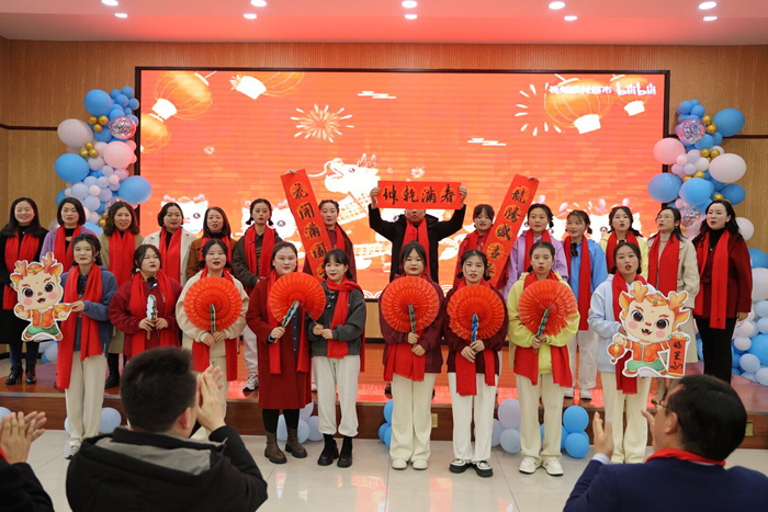 由总校各学科组和各校区根据学科特点精心编排精彩节目轮番上演,数学组的串烧《多姿多彩送祝福》、体育组的串烧《躁起来,无极限》、道德与法治和心理学科组的《红歌串烧》、音乐组的歌伴舞《相亲相爱》、科学组的实验展示《放学塑料火箭》、英语组的《英文歌曲串烧》、美术组融现场画龙和演唱为一体的节目《天地龙鳞》、语文组的集体诗朗诵《你好,2024》,水田沟校区集体诗朗诵《我骄傲我是一名教师》、花园校区独唱《祖国之恋》、徐岭校区情景剧表演《欢乐直播间》等节目精彩纷呈,中间还穿插游戏互动环节,不断掀起年会的高潮,欢呼声、掌声此起彼伏。年会在大合唱《明天会更好》中圆满落幕。