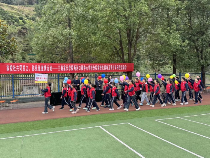 开幕式在雄壮的《运动员进行曲》中进行,校旗队、鼓号队及各班级运动员、家长、教师方阵迈着矫健的步伐、喊着嘹亮的口号依次入场,精神抖擞。两河口社区书记、家委会主任及校长分别致辞,强调家校社共育的作用。