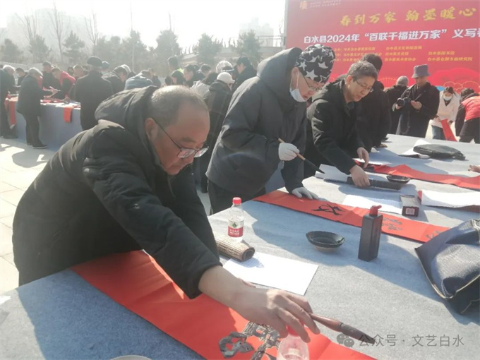 为深入学习贯彻习近平文化思想,丰富城乡群众春节文化生活,1月29日,由中共白水县委宣传部、县文化和旅游局主办,县文联、县文化馆、县图书馆承办,县书法家协会、县美术家协会、仓颉书画研究院协办的“白水县2024年“百联千福进万家”文化志愿者义写春联活动”在白水公园举行。