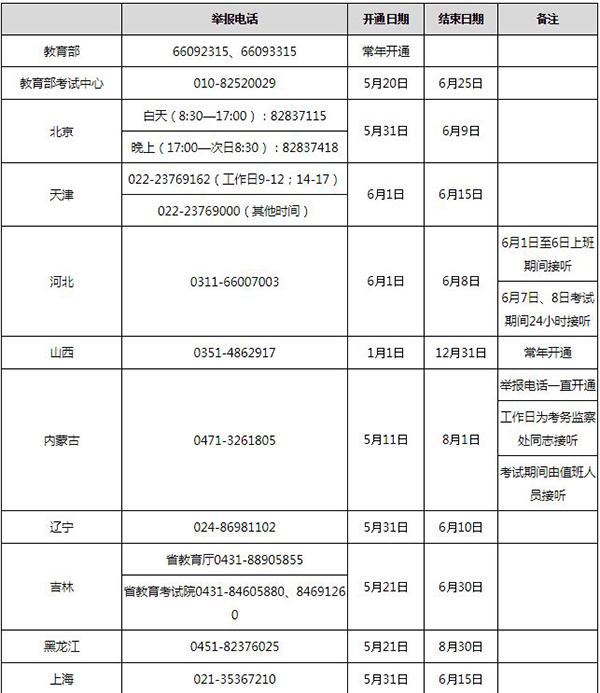 近日,教育部统一公布了教育部以及全国31个省(区、市)教育行政部门和招生考试机构2018年的高考举报电话,考生、家长及社会各界人士可致电及时举报反映涉及2018年高考安全的线索。 教育部及各省(区、市)将会同有关部门根据举报线索第一时间核查处理,坚决维护高考公平公正。 其中,教育部的举报电话常年开通,教育部考试中心举报电话5月20日开通后,6月25日结束,而北京举报电话开通周期为5月31日至6月9日,早晚24小时值班。 包括河北、江西、重庆、四川等在内的省份高考期间24小时开通接受举报。 附各省份举报电话:
