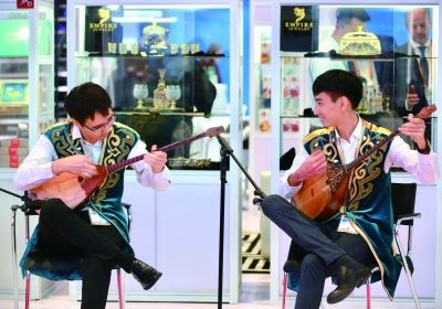 哈萨克斯坦馆内两位艺术家现场演奏哈萨克民族传统乐器冬不拉。 中韩两国互为近邻,历史文化渊源悠久,文化领域的合作基础十分深厚。此次,韩国文化产业振兴院携BARUCK、Designseol、HEROS Entertainment等12家动漫、游戏企业在文化和旅游展区亮相。“我们注意到习近平主席在开幕式主旨演讲中提到‘预计未来15年,中国进口商品和服务将分别超过30万亿美元和10万亿美元’,这些数字让我们感受到了中国坚持实施对外开放政策的决心和信心。有理由相信,未来中韩文化贸易领域的交流发展必将拥有更加广阔的空间。”韩国文化产业振兴院海外事业组部长金纪宪希望能够以进博会为契机,为中韩文化贸易领域的发展合作注入新活力。 文化和旅游展区能够为首届进博会增添如此独特的底蕴和风采,离不开中国文化和旅游部服务大局,全力以赴做好招商招展、旅行服务保障和文化氛围烘托等方面的工作。据了解,为把文化和旅游展区打造成本届进博会的亮点,文化和旅游部党组高度重视相关筹备工作,积极发挥驻外文化和旅游机构作用,加强了对上海市文广局、旅游局及中国对外文化集团公司、国家对外文化贸易基地(上海)等相关单位的指导。作为本届进博会文化和旅游展区的重要组展机构,在文化和旅游部指导下,中国对外文化集团公司汇集了来自全球五大洲9个国家和地区的17家机构参展,类型涵盖动漫游戏、视觉和表演艺术、非物质文化遗产、知名文化IP四大板块。“为了与本届进博会的主题更加贴切,在展示文化产品的同时,特别侧重对知识产权保护和文化IP孵化类的企业进行推介,希望依托进博会搭建起国际文化贸易平台,助力我国文化产业的健康可持续发展。”中国对外文化集团公司相关负责人表示。得益于这些辛勤工作,首届进博会的文化和旅游展区向八方来宾充分展现了改革开放40年来中国特色社会主义建设的伟大成就和新时代中国国家形象。