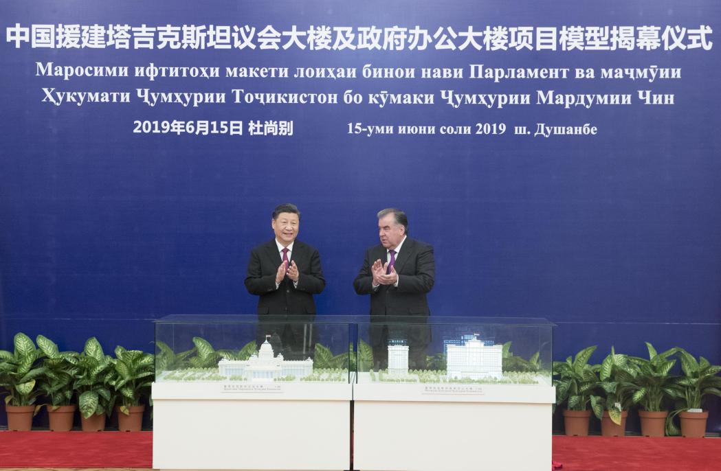2019年6月15日,习近平在杜尚别同塔吉克斯坦总统拉赫蒙共同出席中方援塔议会大楼、政府办公大楼项目模型揭幕仪式。 6月15日,塔吉克斯坦总统府仪式厅,习近平和拉赫蒙共同出席了中方援塔议会大楼、政府办公大楼项目模型揭幕仪式。覆盖在沙盘上的红绸缎徐徐揭开,两座建筑模型展现在眼前。现场响起热烈掌声。
