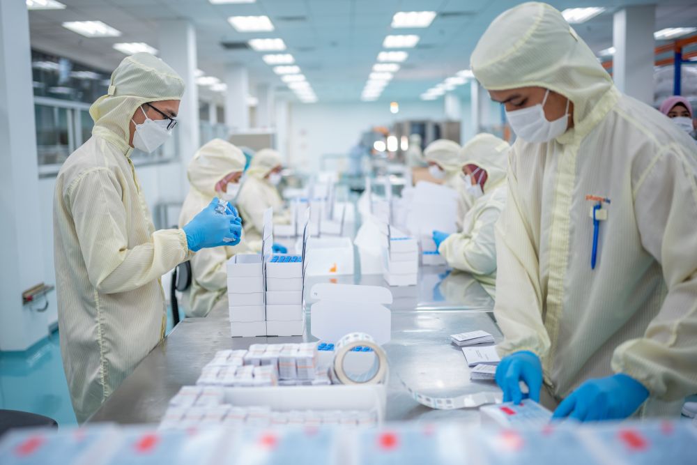 ↑2021年10月5日,在马来西亚吉隆坡郊区的发马公司灌装工厂,工人在包装本地灌装生产的科兴疫苗。本地灌装中国疫苗已成为马来西亚的骄傲。