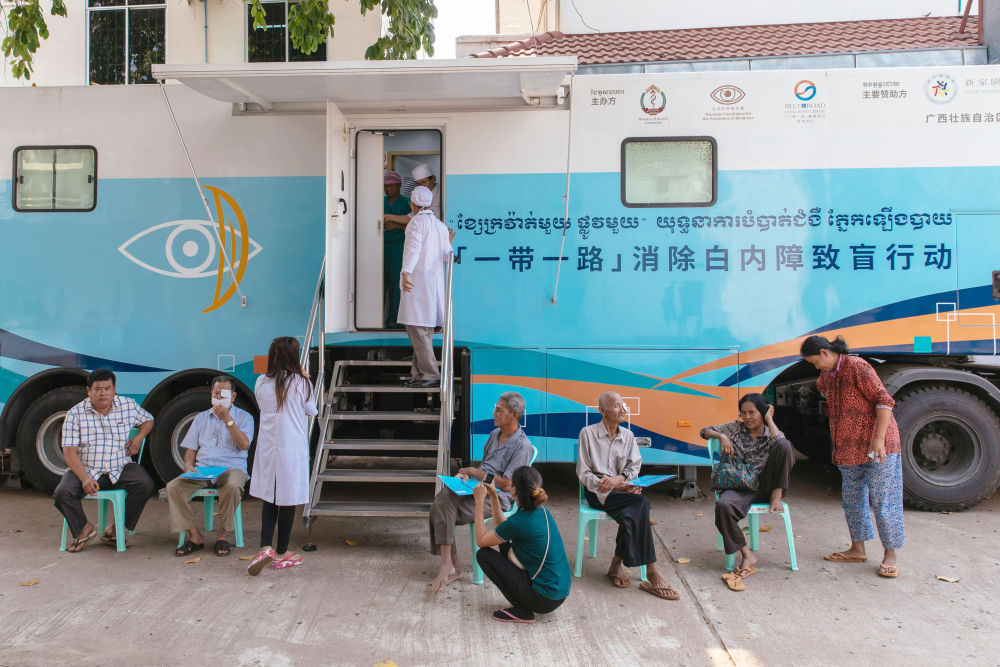 ↑2019年3月15日,在柬埔寨磅湛省医院,白内障患者在“一带一路”消除白内障致盲行动医疗队的医疗车外等待接受手术治疗。
