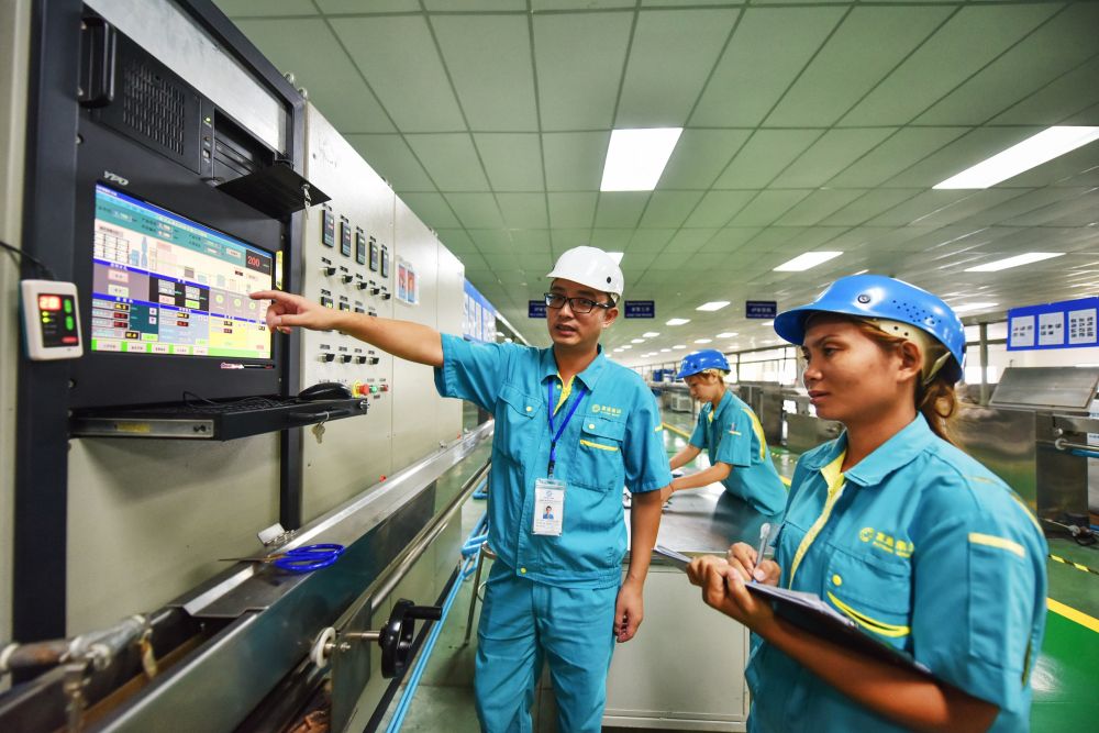 ↑2015年5月11日,在泰国罗勇的泰中罗勇工业园,中国技术人员(前左)对泰国工人进行技术指导。