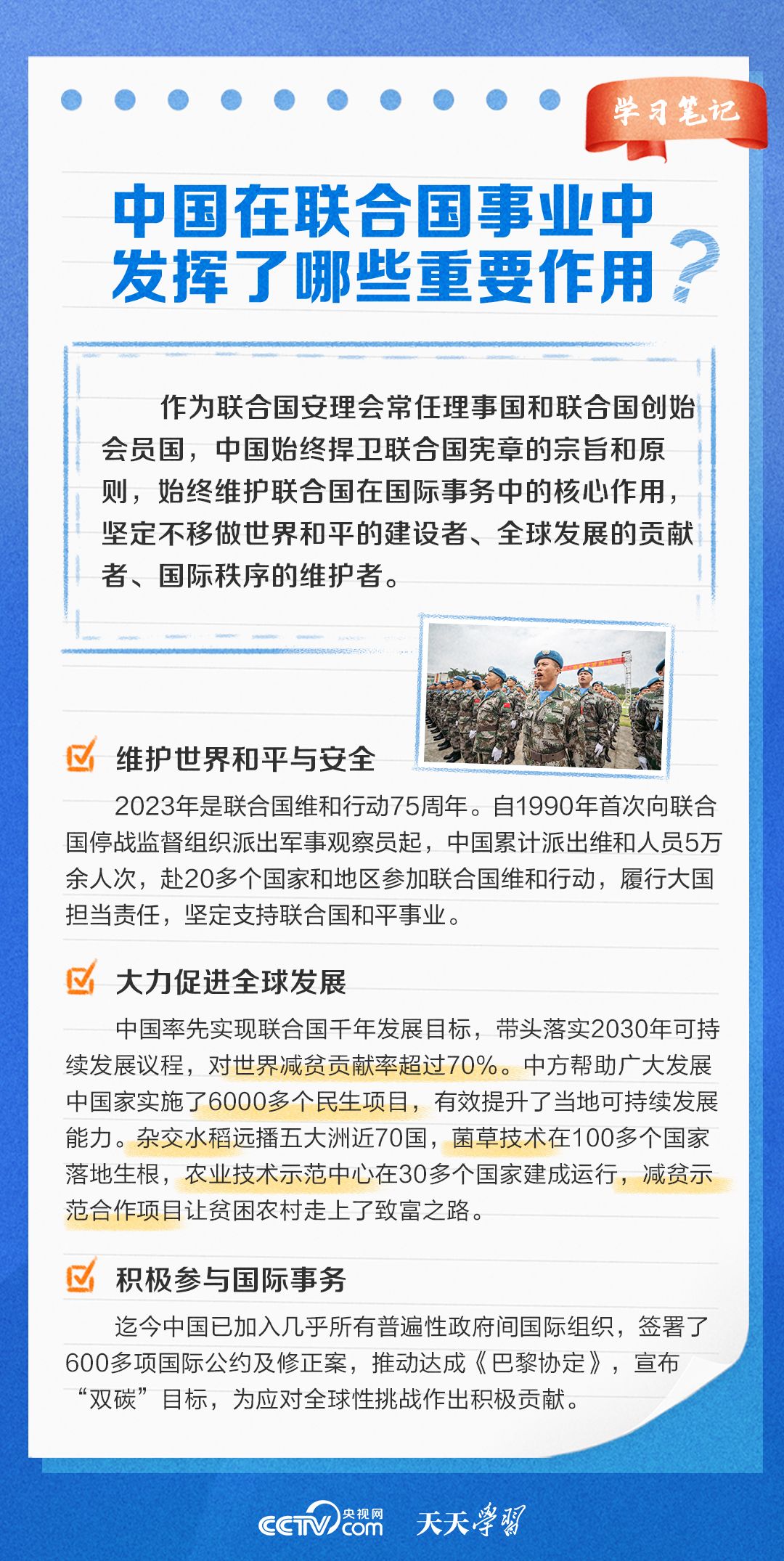 1945年10月24日,《联合国宪章》正式生效,联合国宣告成立,为国际关系发展开启了新篇章。作为世界上最具普遍性、代表性、权威性的政府间国际组织,联合国坚持推进多边主义,为维护世界和平、促进共同发展发挥了不可替代的作用。 在联合国成立78周年之际,央视网《天天学习》栏目特梳理联合国相关知识点及我国在联合国事业中发挥的重要作用,与您一起学习。