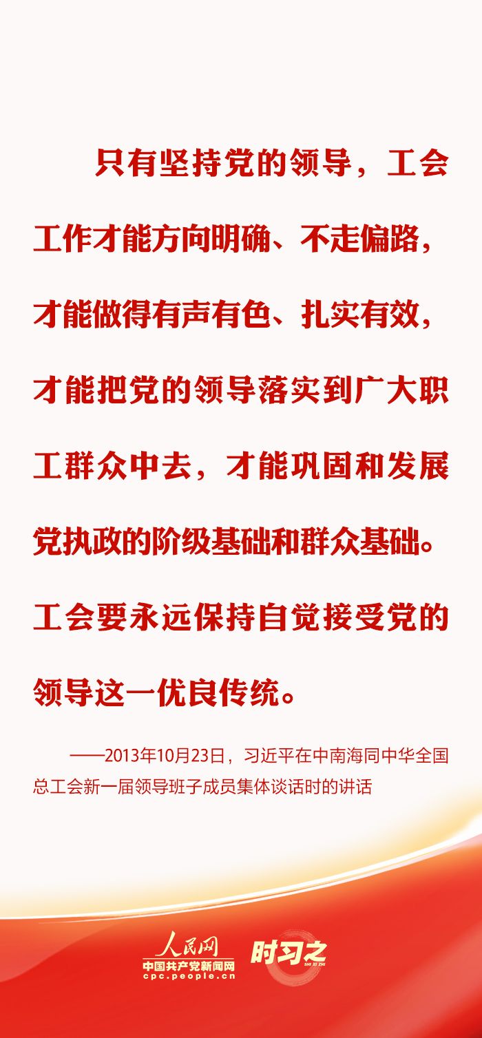 时习之丨推动新时代工会工作发展 习近平强调坚持党对工会的全面领导 来源:人民网-中国共产党新闻网 作者: 时间:2023-10-27