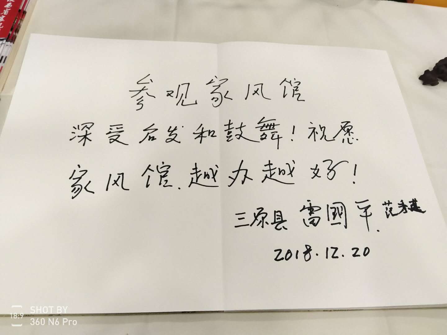 环视整个展示大厅,从老一辈革命家的红色家风到古代先贤的家规、家训;从当代三秦“最美家庭”的动人故事到陕西荣获第一届全国文明家庭事迹简介,我粗略计算了一下,这里展示的大约百家之多的前世今生,犹如一个百花盛开、五彩缤纷、姹紫嫣红的百花园,将三秦大地的春天妆扮得更加美丽,吸引了广大群众纷至沓来,从中吸取智慧和力量,为建设美好家园、实现中华民族伟大复兴的中国梦而聚集正能量。 流连往返的参观、学习,不知不觉中近两个小时过去了。临别,张琴主任邀我们到留言台,留下一句话。我略加思考,提笔歪歪扭扭地写下了“参观家风馆,深受启发和鼓舞。祝愿家风馆越办越好!” 三原县雷国平、范秀莲 2018.12.20