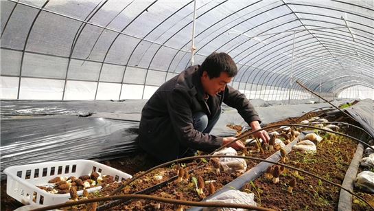 羊肚菌种植大棚 国际在线陕西消息:羊肚菌作为一种有名的天然食用菌,它的珍贵不仅在于独特的美味和丰富的营养,还在于它的不可多得,可遇不可求,在市场上一直价格不菲。然而,2019年的开春,陕西省黄龙县白马滩镇的农民却迎来了新春第一喜:他们人工种植的羊肚菌长出来了。 “真的太惊喜了,我的羊肚菌长势很喜人,前几天先开了四个大棚,采摘了两百多斤,还有一些长得正起劲,保守估计亩产一百斤鲜羊肚菌应该不是问题。好多人也在观望,计划一起入股呢,毕竟有专人指导还有政府策划销售……”白马滩镇贫困户杜养斌喜不自禁的夸赞着。 为全面打赢脱贫攻坚战,黄龙县白马滩镇坚持党建引领促脱贫,以土地做“嫁衣”,积极与帮扶单位西安市朱雀管委会沟通协调,与西安文理学院校地联建,为壮大村集体经济,踌躇满志,走上产业发展转型之路。 2018年7月份,白马滩镇突破重重阻碍,克服种种困难,筹备健全一系列基础设施,终于引进羊肚菌反季节种植,变“输血”为“造血”,带领群众脱贫致富。