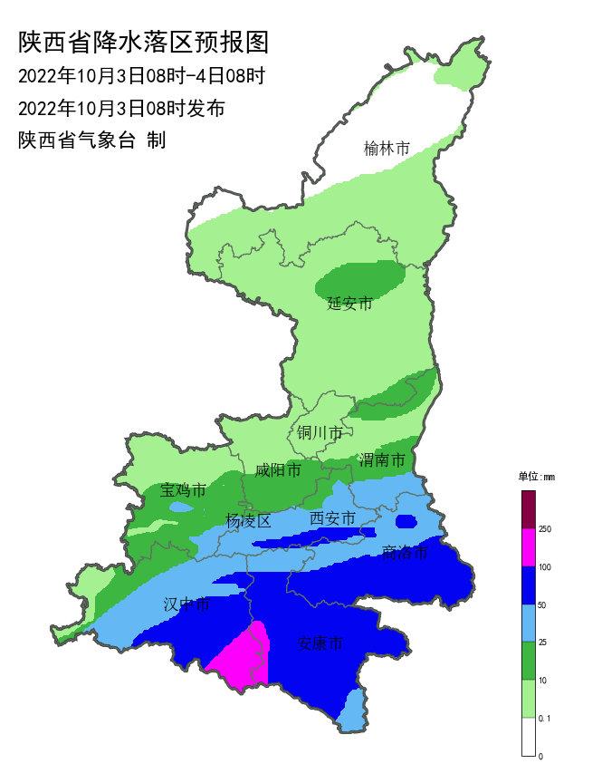 陕西省气象台2022年10月3日8时继续发布暴雨黄色预警:受副高外围暖湿气流和冷空气共同影响,预计3日8时至4日8时:关中南部、陕南大部有大雨(25~50毫米),其中西安(周至、鄠邑区、长安、蓝田)、汉中(南郑、城固、洋县、佛坪、西乡、镇巴)、安康(宁陕、石泉、汉阴、紫阳、汉滨区、旬阳、岚皋、平利)、商洛(镇安、柞水、商州、洛南、山阳、丹凤、商南)有暴雨(50~80毫米),镇巴、石泉、紫阳、汉阴局地有大暴雨(100~120毫米)。过程期间局地伴有短时暴雨、雷暴大风等对流性天气,最大小时雨强30~50毫米。上述地区的相邻县区也需高度关注。强降水影响区域易出现滑坡、泥石流、崩塌等地质灾害,山洪和中小河流洪水气象风险等级高,请做好应急准备工作,关注当地预警信号和短临预报,适时采取应急措施。 另外,陕西省气象台2022年10月2日11时00分发布的大风(降温)蓝色预警继续生效,今天白天秦岭及以北地区陆续出现6级左右大风,自北向南日平均气温下降6-8℃左右。