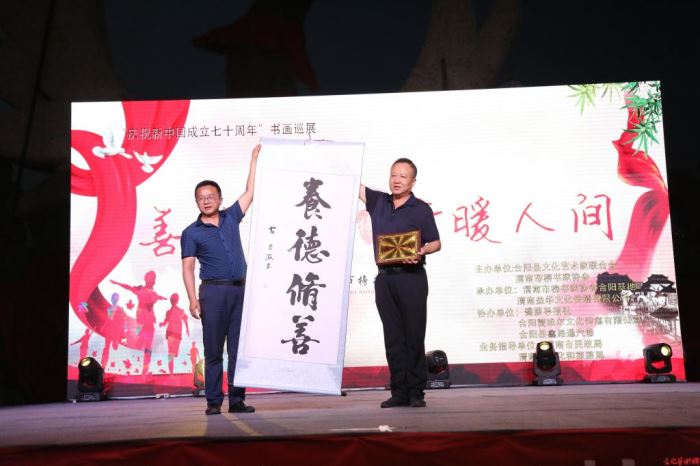 文化艺术网-文化艺术报讯(记者 宋光)7月20日,由渭南市榜书家协会发起的为期三天的庆祝新中国成立70周年大型书画巡展暨“善行天下 情暖人间”公益活动在合阳县爱唯尔文化广场落下帷幕。本次活动旨在弘扬真善美,传递新风尚,凝聚正能量。