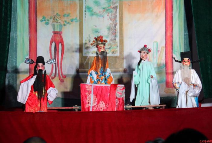 孩子们目不转睛地观看 吴燕峰摄 当天下午,人们就早早坐在用钢架和一人多高的布幔围搭的戏台前等待,身着戏服的木偶和扮戏的行头、道具,也让孩子们好奇地围观。在激昂的锣鼓声中,扮成青衣、小生、武将、官员等的木偶依次上场,在布幔上方或进退,或打斗,或甩水袖,或抖帽翅,或担水换肩,或吹胡子、喷火,唱念做打、浑然一体;布幔后面,艺人们高举木偶或站立不动,或疾步快走,或翻转腾挪,一边熟练地操纵木偶表演,一边唱着秦腔,乐师们有板有眼地敲打锣鼓家什,忙而不乱、配合默契,精妙逼真地表演《薛丁山征西》、《相公卖水》等曲目;台前的观众不时叫好、鼓掌,孩子们更是目不转睛地观看。
