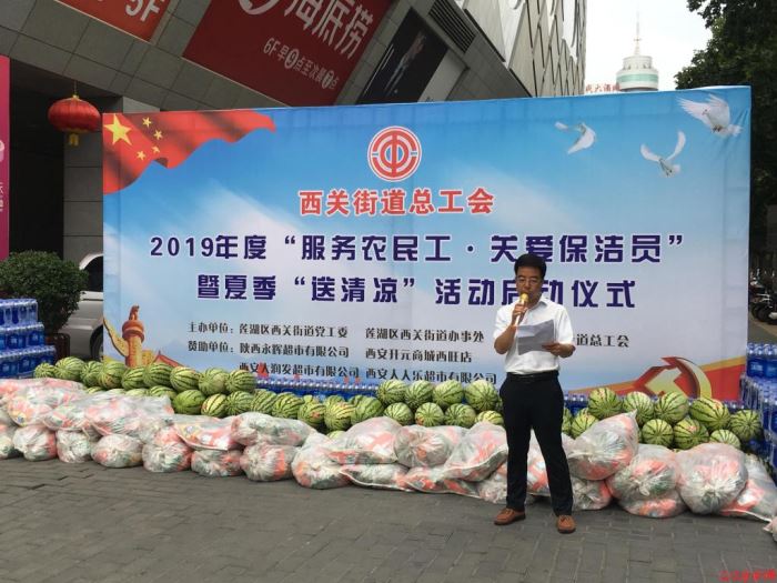 文化艺术网-文化艺术报讯(通讯员 吴文)8月1日上午9点半,西安市西关街道总工会举办的2019年度“服务农民工·关爱保洁员”暨夏季“送清凉”活动在开元商城西旺店广场启动。西安市莲湖区总工会党组书记、副主席张育军,莲湖区西关街道党工委书记兼街道总工会主席赵锋,西关街道办事处主任昝晓娟和街道班子成员以及企业界人士、环卫所、执法中队、社区工会联合会主席、专干、保洁员代表等共计330余人参加了启动仪式。