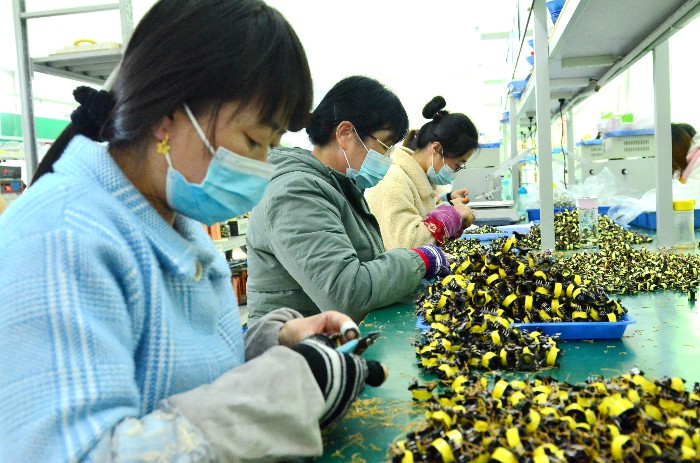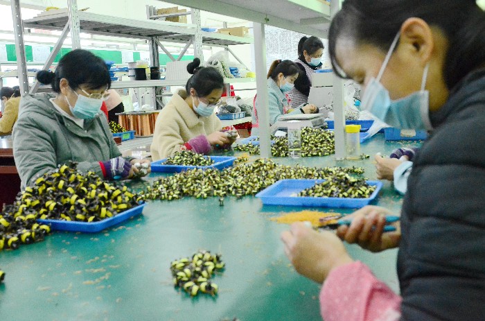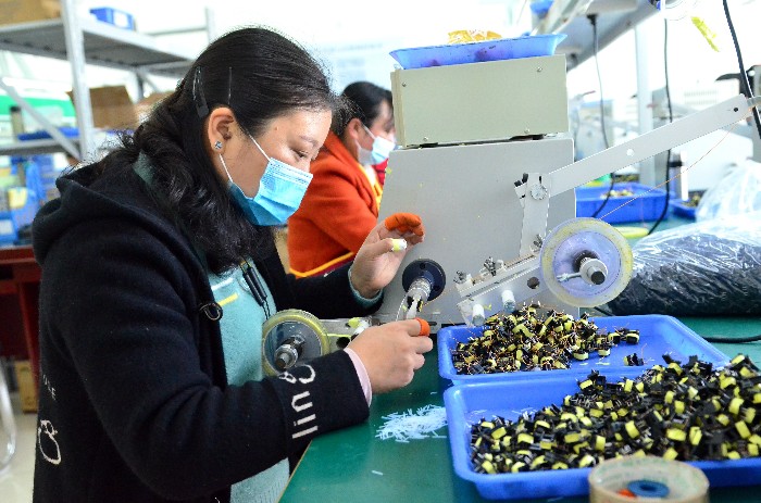 2月20日,记者走进阳平关镇子龙新区社区工厂汉中赋助电子有限公司,厂区各车间一片忙碌,工人们戴着口罩正在全力以赴、开足马力为客商生产高频开关电源变压器。