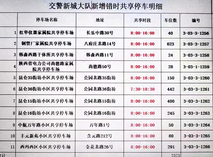 错时停车位明细。 西部网讯(记者 刘望)记者从西安公安交警新城大队获悉,为缓解“停车难”,新城交警主动对接西安新城国有资本运营集团,对辖区万年路小区等11个小区2373个车位开展错时共享停车。 特别是针对昆仑小学、昆仑中学上下学停车难问题,昆仑36街坊小区在满足业主停放的前提下,将小区442个停车位共享时间延长为7:30-18:30,接送孩子的家长可以15分钟内免费停车,有效缓解学生上下学造成的交通拥堵。 编辑:晓佳 |