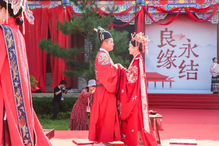 文化艺术网-文化艺术报讯(全媒体记者 高盼成)8月22日,“七夕”传统佳节之际,“良缘永结·山河为鉴——潼关古城集体婚鉴仪式”在秦晋豫三省交界、有着千年历史的潼关古城盛大举行。十六对不同职业的新人身着明式华服,在飞檐斗拱、红墙朱瓦的中式院落里,共同按照沿袭千年的“拜堂、沃盥、对席、同牢、合卺、结发”周礼婚俗永结良缘。