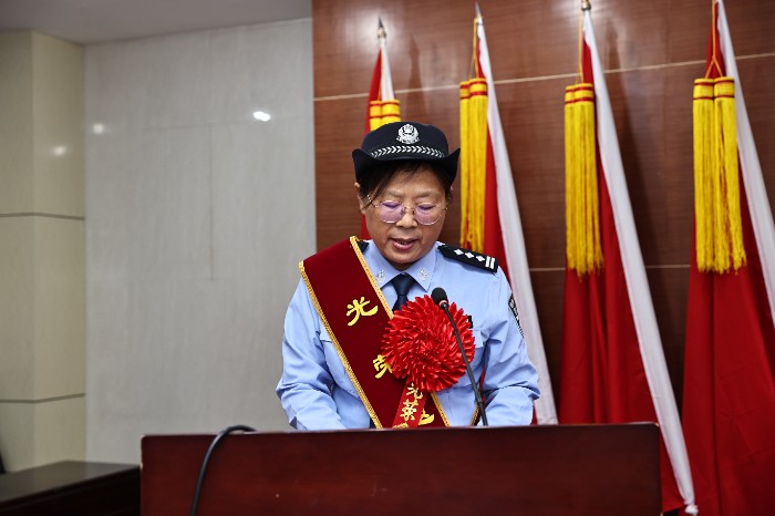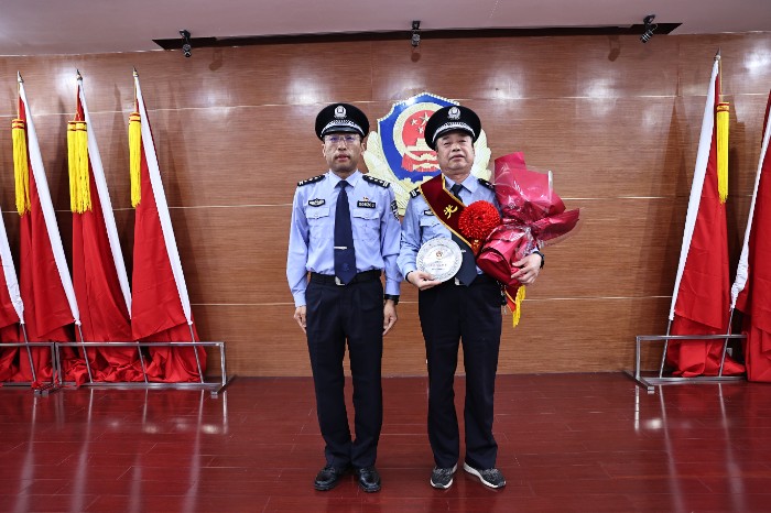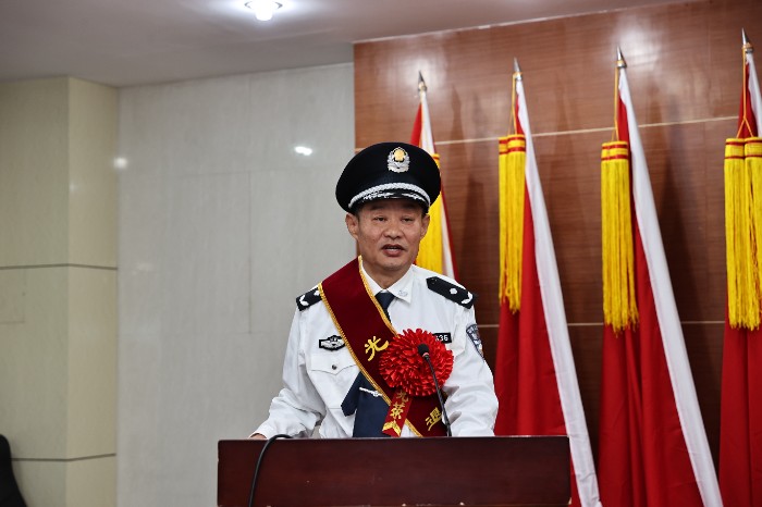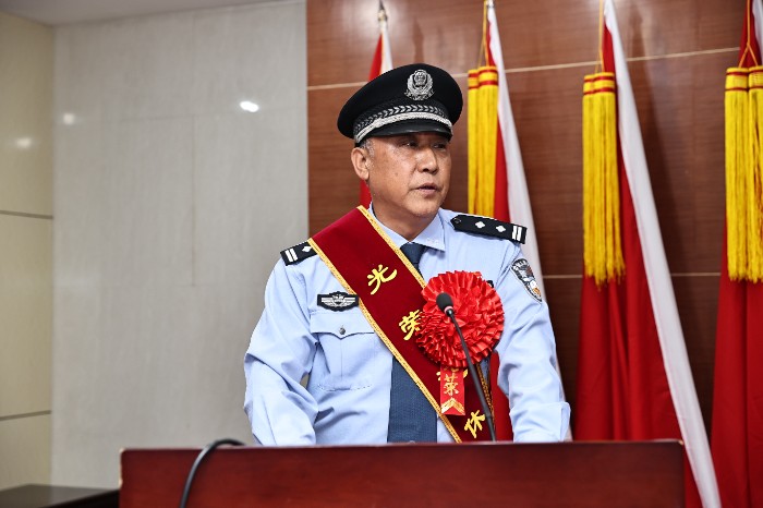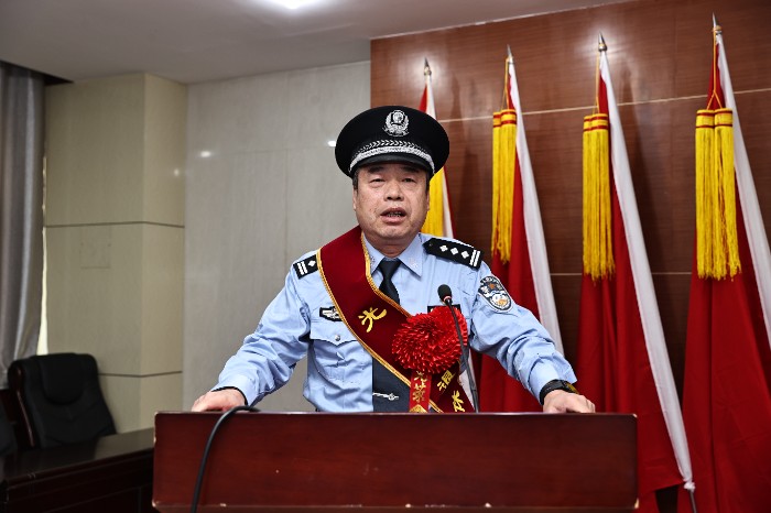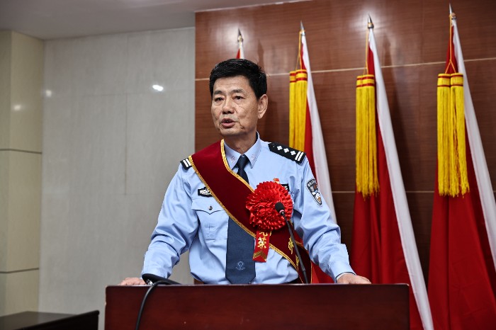 最后,高新区党工委委员、分局党委书记、局长王涛代表高新分局党委致辞。他指出,举行简朴而隆重的退休荣誉仪式,是对老同志为公安事业艰苦奋斗、鞠躬尽瘁,一生热爱、一生奉献、一生坚守的致敬,也是接过老同志手中的旗帜,薪火相传、接续奋斗,做好接棒人的传承。分局全体民警要以老同志为榜样,爱岗敬业、忠诚奉献,牢记嘱托,不辱使命,为高新公安事业高质量发展贡献力量。同时,他还对与会人员提出了几点希望。他希望,退休的老前辈:宁移白首之心,不坠青云之志。希望老同志们头顶的警徽光芒依旧,永葆人民警察的风范和气节,退休不退志,一如既往地关心和支持公安工作,为高新公安发展建言献策,分局党委和各部门也将一如既往服务支持退休同志,高新分局永远是咱们的家,欢迎老同志多回家看看。希望在座的民警们,船到中流当奋楫,山行半腰再添力。希望大家接过前辈们手中的枪,肩负他们的希望,再接再厉建新功,续写辉煌谋新篇,以坚强的党性、强烈的担当、务实的作风、严明的纪律,为高新公安不断增添新的荣耀!希望新入警的同志们:千淘万漉虽辛苦,吹尽狂沙始到金。既然选择了人民警察作为终生追求的事业,就要用谦虚、踏实、积极的态度,虚心向老民警学习,早日成为独当一面的行家里手。在工作中将面对善与恶的挑战、日复一日的奔波和辛劳,但要始终保持积极向上的工作态度,坚守初心,牢记使命,用忠诚、奉献捍卫警察的誓言,坚持矢志不渝传承好高新公安的优良品质和作风,踏着老前辈留下的足迹,继续勇毅前行。