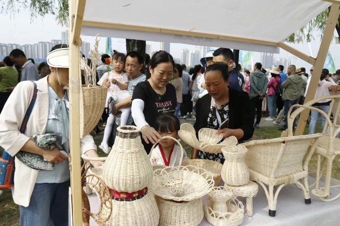 集市现场,文创展销花车沿江排开,展示了汉中藤编、两河手工扇、仿真多肉盆栽等传统手工艺品,以及秦巴土蜂蜜、“味见汉中”特产等地方风味。更有融合传统文化与现代设计元素的焦墨绘画麦秸画创意产品,令人目不暇接。
