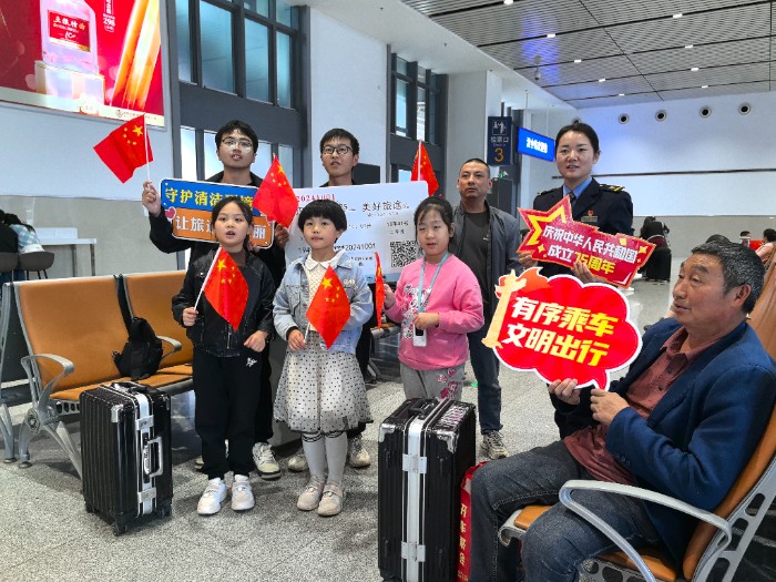 10月1日,汉中车务段联合汉中市文旅局,在汉中站站前广场、候车大厅内,以庆祝中华人民共和国成立75周年为主题,上演了一场精彩的传统文化与文明出行主题相结合的快闪活动,吸引了众多旅客驻足观看并打卡留念。