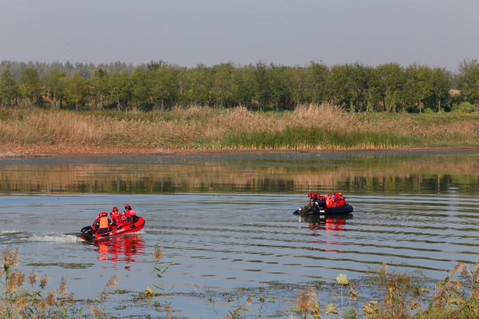 演练假设某地发生洪水自然灾害,有一人或多人在不同水域发生落水和冲锋舟翻舟情况,救援信息发出后,华阴、大荔、华州三地的民间救援组织在第一时间进行人员集结,携带装备迅速赶赴现场立即展开救援工作。救援队员们利用橡皮艇和冲锋舟在水中躲避杂草、礁石等障碍物后,采取O型救援、活饵救援、浆板救援、抛绳包救援、岸边快速救援等多种救援方式将落水者在第一时间救至岸边,并送上救护车。
